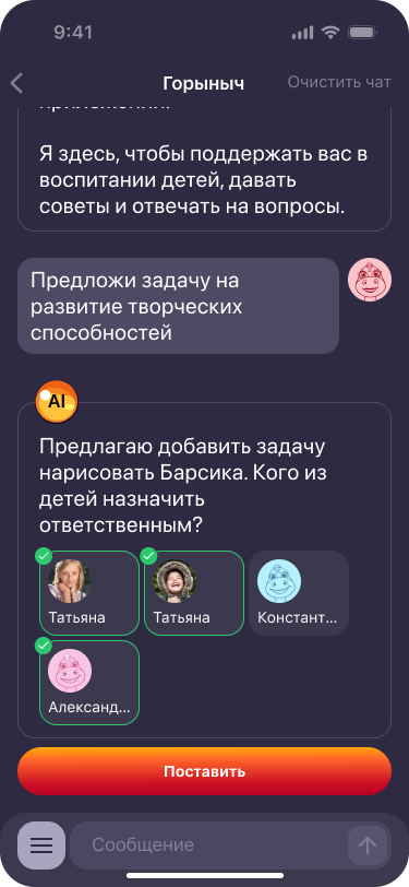 Используя данные о семье, мы создаём AI-друга для Ребёнка и персонализированного AI-помощника для Родителей, который даёт советы в самых разных ситуациях
